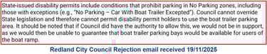 Redland City Council rejected the suggestion and will continue to fine cars with displayed Disability Permits in that Zone: see attached email snip.