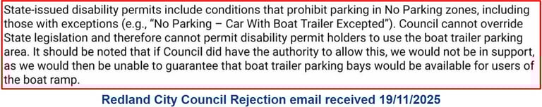 Redland City Council rejection is clearly disability discrimination as this impedes the independence, accorded to the disabled, by TMR document 'Access rights under Disability Standards for Accessible Public Transport’ ie: Translink ferries.
