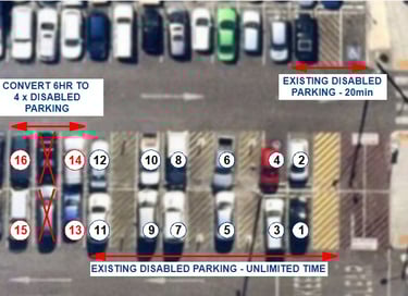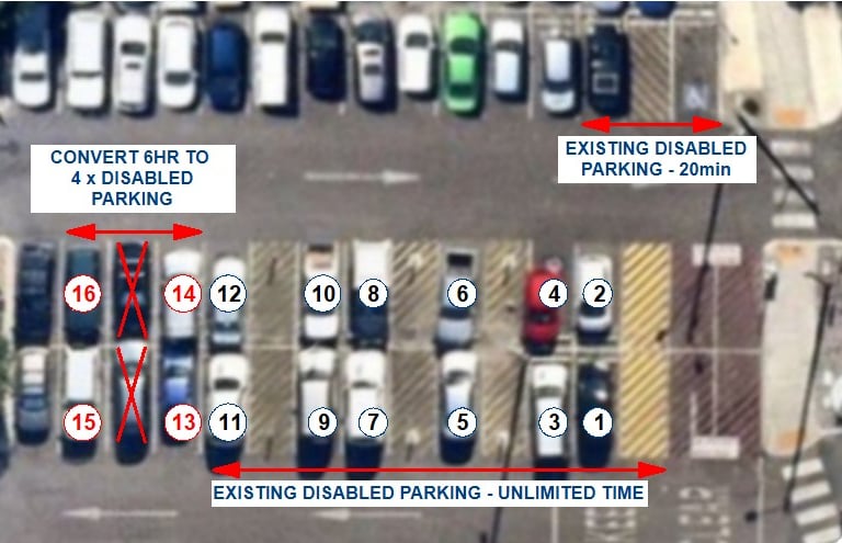 2: That RCC convert the adjacent 6 x 6HR parking bays into an additional 4 x Disabled Parking bays. (refer map)