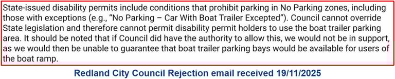 Redland City Council rejected the suggestion and will continue to impose fines to cars even when with displayed a Disability Permits in that Zone